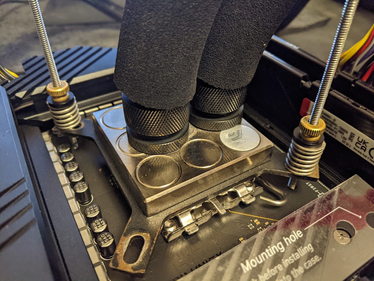Для исследования максимального потенциала платформы к процессу также привлекался контур водяного охлаждения: водоблок EK-Supremacy Acetal+Nickel, две помпы Hydor Seltz 1200, чиллер Hailea HC-300A, бак воды 15 л. Крепеж импровизированный.