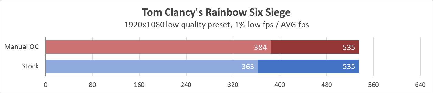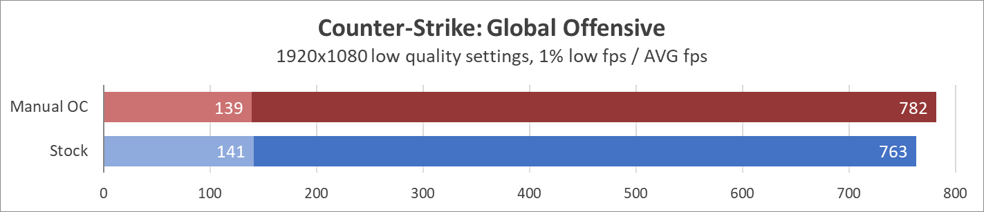 Температура в помещении равнялась 20 градусам по Цельсию. Замер энергопотребления платформы проводился с помощью энергометра Feron TM55 в течение 10 минут в режиме нагрузки (забег LinX) и простоя. Замер температур на ключевых узлах исполнен с помощью термопары К-типа и термометра Benetech GM1312. Управление оборотами вентилятора — автоматическое. Частотный потенциал ключевых узлов исследовался шагами напряжений 0,025 В, стабильность системы проверялась комплексом нагрузок в виде LinX (problem size 28432, 10 итераций), а также прохождением Y-cruncher на пресете Pi-1b. Каждый бенчмарк запускался пять раз, в результатах указано среднее арифметическое, тоже самое касается игр. В играх происходила запись телеметрии (1% low FPS + Average FPS) при помощи Riva Tuner Statistics Server. В CS:GO — тест на карте мастерской FPS Benchmark от начала сцены бенчмарка до третьего звукового сигнала на черном экране в конце, остальные выполняются на стандартных сценариях.