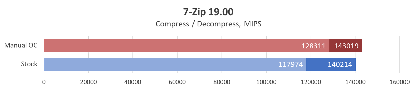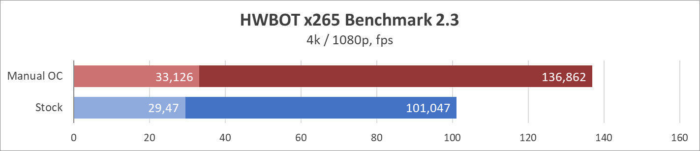 Из чего следует логичный вывод о том, что если плата выдержала такое, и все еще готова навалить сильнее, то более простые процессоры для нее вообще не проблема. Ну а теперь самое время показать какие показатели гарантирует материнская плата на заводских параметрах (установлен режим Boxed Cooler с включенным профилем XMP), а также ручном разгоне (его настройки уже указаны немного выше):