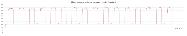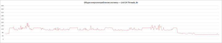 Затейливо выглядит график кривой потребления энергии на этом участке тестирования. Отчётливо видны этапы до и после проведения вычислений, а сам их ход характерен абсолютной непредсказуемостью. 55 и 195 Вт — границы потребления на этом участке замеров.