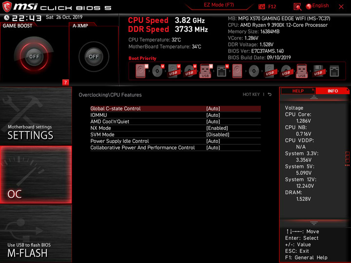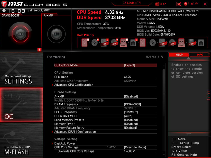 Принцип и очерёдность проведения собственных экспериментов будет совпадать с применённым подходом в обзоре ASUS ROG Crosshair VIII Formula. Общее поведение платы на этапе разгона ОЗУ мало в чём отличалось от характера MSI MEG X570 Ace. Лёгкие тесты функционируют с разогнанными до 3800 МГц модулями, но для 20 минут в LinX необходимо откатиться до 3733 МГц. Частота FCLK равнялась 1866 МГц. В UEFI потребовалось установить 1,5 В для нужд DRAM Voltage, а плата этот показатель немного завышает. Стабилизация SOC Voltage проходила со схемой LLC Mode 3. GDM для тестового набора памяти необходимо было активировать. С целью минимизации влияния на быстродействие системы ещё проводилась деактивация управления процессорным вентилятором, то есть частота вращения всё время была стабильно высокой.