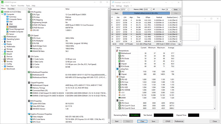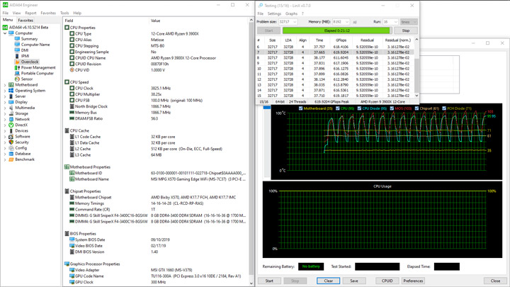 Повышенная продуктивность системы в LinX была ожидаемой, в среднем частота ядер там не превысила 3900 МГц. В целом, показатели вышли схожими с полученными на более дорогой модели MSI, прежде упомянутой. Разница оказалась в технических нюансах. Так, здесь заметно сложнее достигается стабилизация SOC Voltage, это если поглядывать на датчик CPU/NB, показывающий выработанное напряжение на VRM, но с подобранным режимом LLC целевые 1,1 (по факту — 1,094) вольт всё же достигаются. С температурой стабилизатора в этой части обзора не было никаких проблем, в этом можно убедиться, анализируя цифры с датчика MOS в AIDA64.