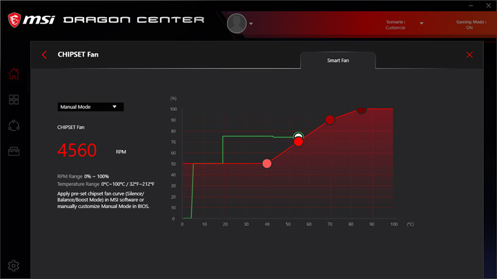 Разгон BCLK здесь не предусмотрен вообще, потому последнее, чему стоит уделить повышенное внимание — режим работы штатного вентилятора для охладителя хаба. На скриншотах можно было видеть волнообразную «траекторию» кривой температуры чипа. Это объясняется циклами запуска и остановки крыльчатки. Последний момент создаёт, как бы странно это не звучало, больше всего шума. Приравнять его можно к парковке головок на традиционных HDD. В условно-бесшумных ПК этот нюанс будет заметно раздражать, в случае, когда рабочий коридор температур окажется на стыке старта и остановки вентилятора, как у нас со стендом. Здесь потребуется либо наладить его работу и при более низких температурах, это при минимальных оборотах обеспечит тихий режим всей системе, либо сместить точку пуска ещё дальше. Производитель заготовил три профиля, их можно оценить по снимкам экрана.