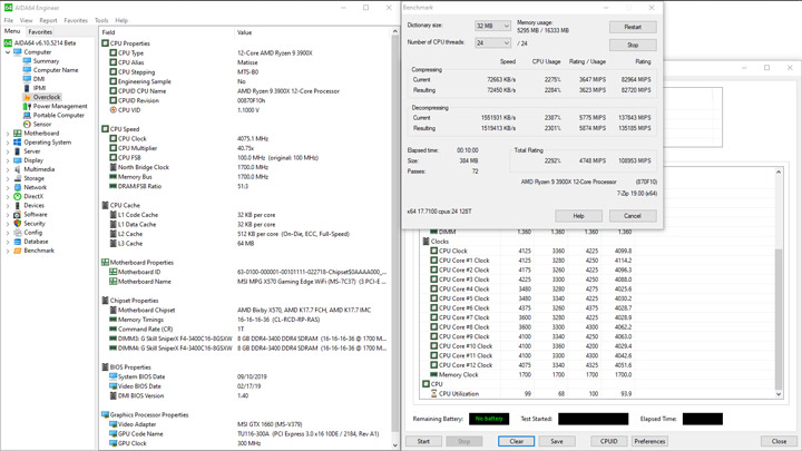 Максимальная частота процессора фиксировалась при замерах ПСП — 4650 МГц. Для однопоточного бенчмарка 7-Zip пиковой отметкой были 4625 МГц, а для Cinebench характерна цифра 4475 МГц. Средними значениями в многопоточных сценариях оказались цифры, близкие к 4,1 ГГц. Температурные отметки и прочие переменные можно оценить самостоятельно по снимкам экранов.