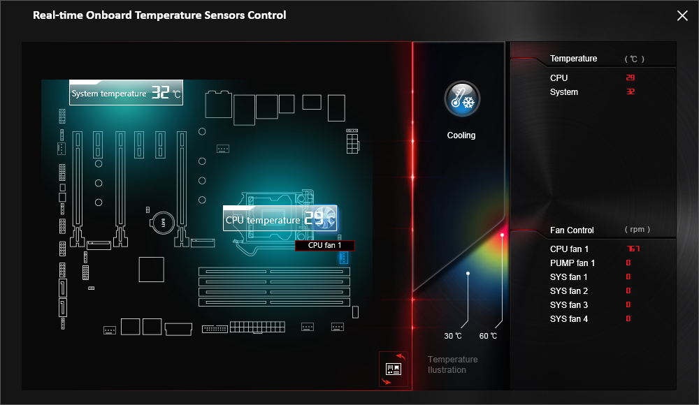 Система мониторинга подразумевает запуск отдельного, независимого окна, его содержимое можно оформить по своему предпочтению. Оказывается, тут есть целых шесть температурных отметок, в отличии от содержания UEFI! Выделю наличие датчиков MOS, PCI-E_1 и M.2_1. К сожалению, не совсем понятно, где именно распаяны два последних, в прежнем ПО от MSI — Command Center — этот аспект был тщательнее проработан, убедиться в этом можно было в ходе изучения продукта прошлого поколения — MSI Z370 Gaming Pro Carbon AC.