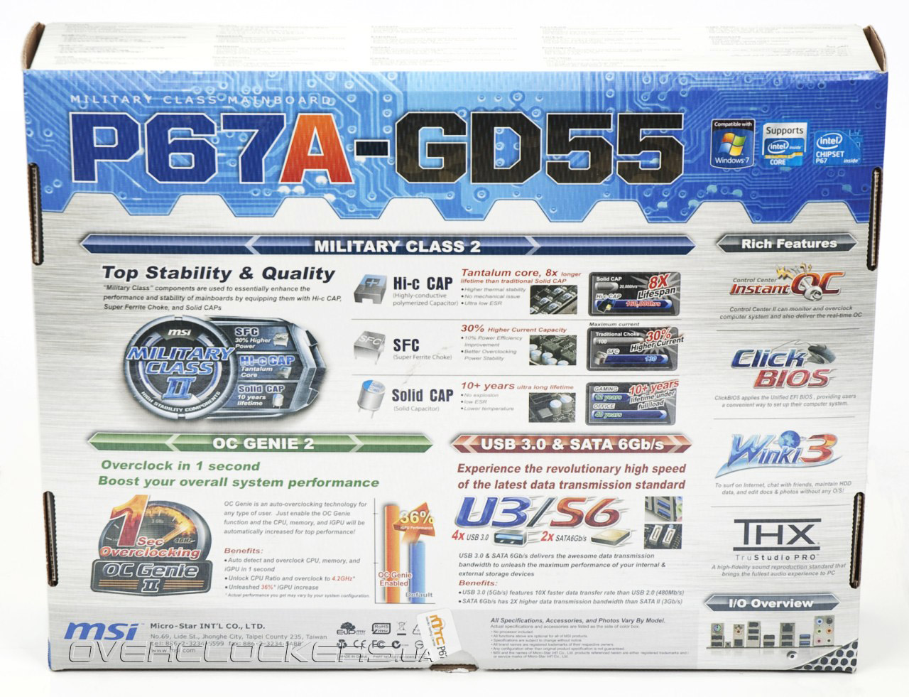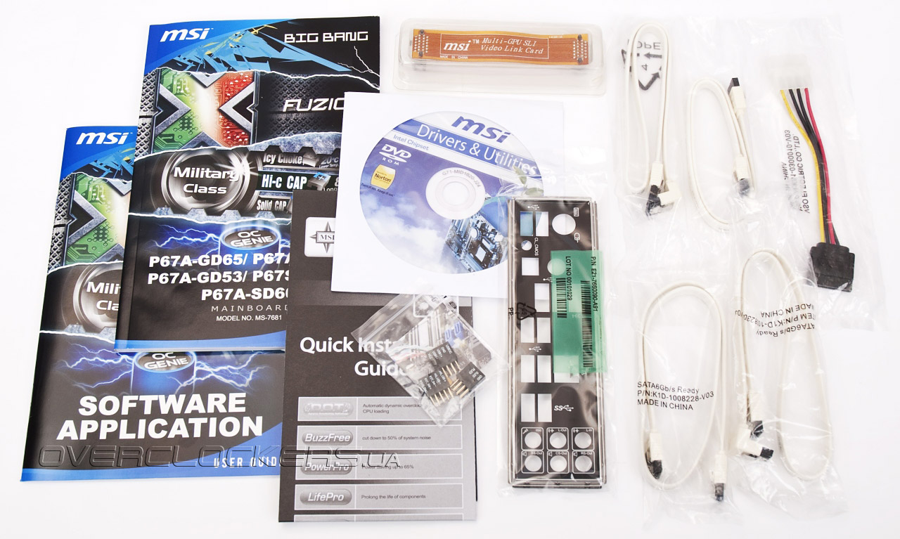 MSI P67A-GD55 поддерживает аппаратно-программный комплекс системного мониторинга и разгона OC Genie 2, который позволяет автоматизировать процесс подбора оптимальных параметров быстродействия. В полной мере обеспечена совместимость с высокоскоростными интерфейсами USB 3.0 и SATA 6 Гбит/с. Системная плата позволяет объединять графические адаптеры в конфигурации AMD CrossFireX или Nvidia SLI. Из информации на обратной стороне мы узнаем, что в качестве прошивки используется Click BIOS, обладающий графическим интерфейсом и некоторыми другими свойствами. Эти и другие особенности мы рассмотрим в соответствующих разделах обзора, а пока приступим к изучению набора аксессуаров.