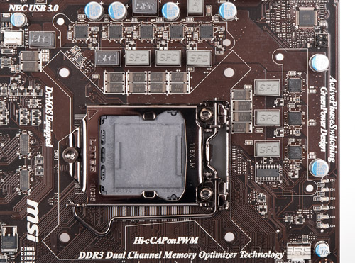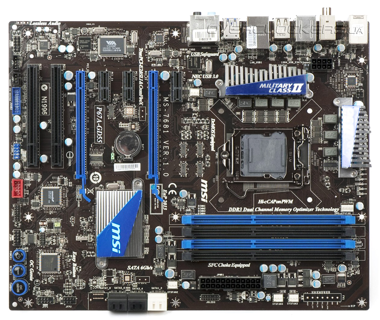Как мы уже упоминали, MSI P67A-GD55 основана на чипсете Intel P67 Express и совместима с процессорами Intel, имеющими разъем LGA1155. Системная плата способна обеспечить работу четырех модулей оперативной памяти DDR3 на частотах вплоть до 2133 МГц в режиме разгона. Их расположение таково, что защелки не будут блокированы даже длинным видеоускорителем. Для построения графической подсистемы предназначены два слота PCI-E 2.0 x16 — поддерживается создание конфигураций AMD CrossFireX и Nvidia SLI. При установке единственной видеокарты следует использовать верхний разъем, к которому подведено 16 линий PCI-E 2.0, при установке второго графического акселератора оба порта делят 16 доступных линий PCI-E 2.0 поровну. Для установки плат расширения можно использовать три разъема PCI-E 2.0 x1 и два «старых добрых» PCI, причем за работу последних отвечает чип-контроллер ASMedia ASM1083. Сами слоты расширения расположены таким образом, что позволяют использовать видеокарты с массивными радиаторами.