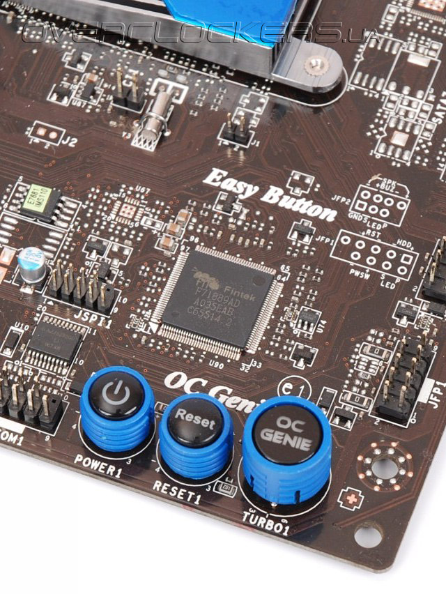 Эти маленькие помощники пригодятся для экспериментов по разгону на открытом стенде, правда фиксировать щупы вольтметра будет весьма не просто. В старших моделях плат MSI мы встречали более практичную колодку с контактами-штырьками.
