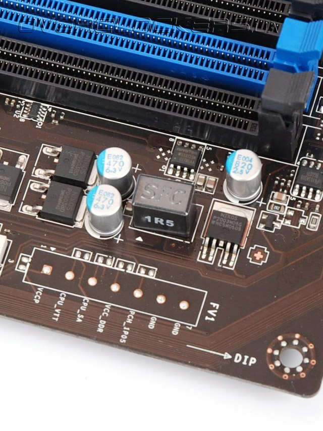 В качестве силовых элементов применены интегральные сборки DrMOS, которые имеют повышенную стабильность рабочих характеристик в широком диапазоне температур. Также отметим использование полимерных конденсаторов с электролитом, в составе которого входят соединения тантала. По заявлениям производителя, элементная база соответствует военному классу надежности, что способствует долговечной работе в условиях повышенных нагрузок и температур. Не осталась в стороне и забота об окружающей среде, которая проявляет в наличии фирменной технологии APS — Active Phase Switching. Благодаря APS количество активных питающих фаз VRM центрального процессора может меняться в зависимости от загрузки, снижая при этом количество потребляемой электроэнергии. При этом текущее количество работающих фаз можно узнать при помощи линейки ярко-синих светодиодов, расположенных рядом с разъемом для подключения процессорного вентилятора.