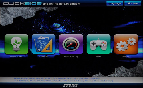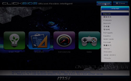 После входа в Click BIOS пользователю предлагается выбрать один из пяти основных разделов: Green Power, Utilities, Overclocking, Games и Settings. Обращаем ваше внимание на то, что доступна также смена языка интерфейса, причем в списке поддерживаемых есть русский язык!