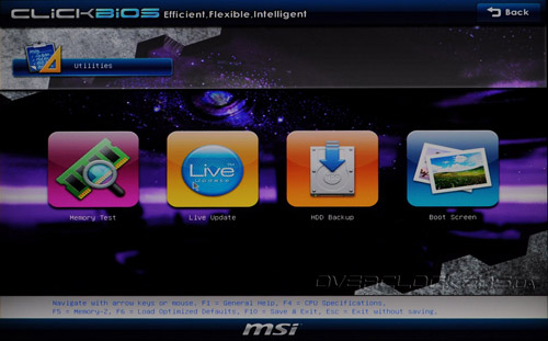 Для любителей разгона наиболее интересны Memory test и HDD Backup. Первый позволяет быстро проверить оперативную память на ошибки, а второй предлагает функции быстрого резервирования/восстановления разделов жестких дисков. Live Update предназначен для обновления прошивки прямо с серверов MSI, для чего необходимо прямое подключение к сети Интернет (PPPoE не поддерживается), а Boot Screen меняет картинку, которая будет отображаться во время процедуры POST.