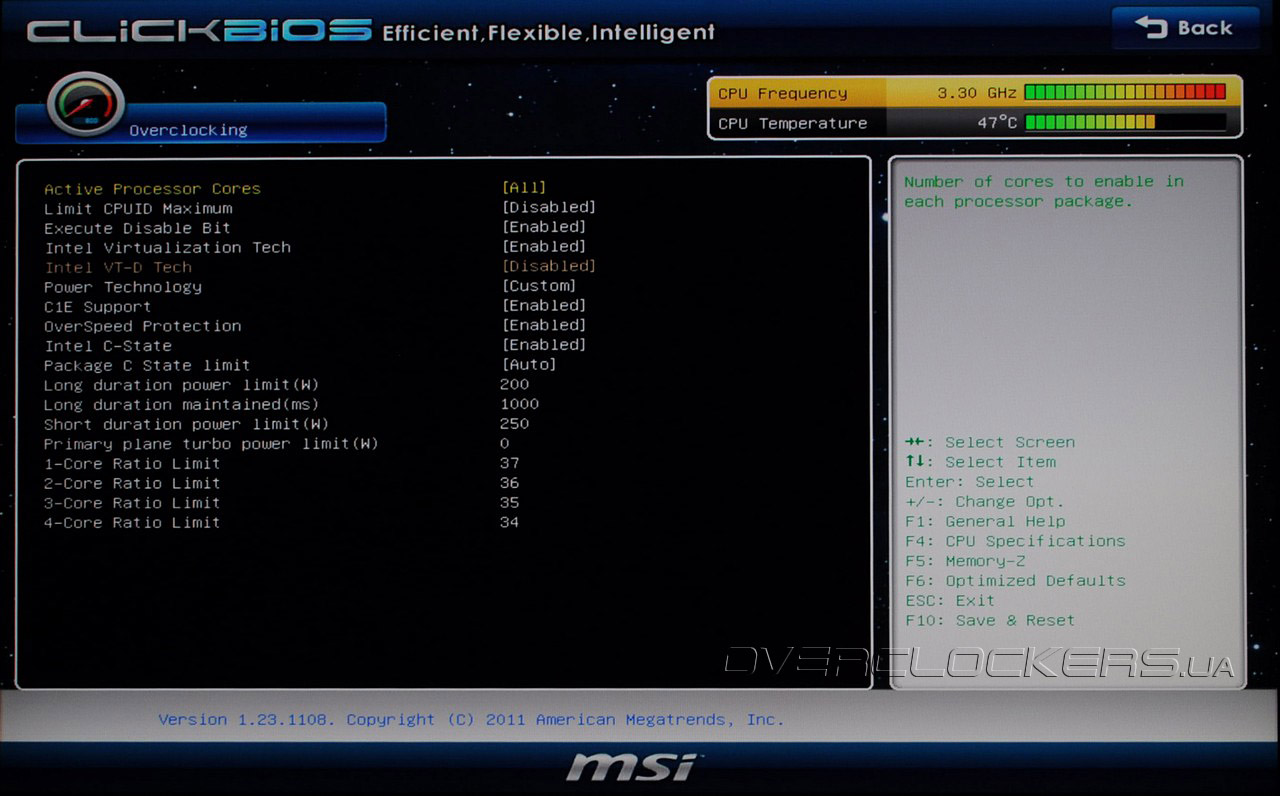 Кроме включения аппаратных средств виртуализации и защиты от вирусов, здесь можно вручную установить множители для режима Turbo Boost, а также гибко настроить лимиты энергопотребления. Однако, без наличия мощной системы охлаждения, мы не рекомендуем чрезмерно повышать верхние пределы во избежание выхода комплектующих из строя.