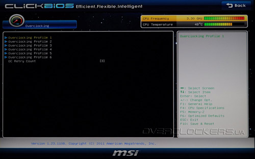 Тут же, в разделе Overclocking, находится подраздел Overclocking profiles, в котором можно сохранить до шести профилей пользовательских настроек прошивки.
