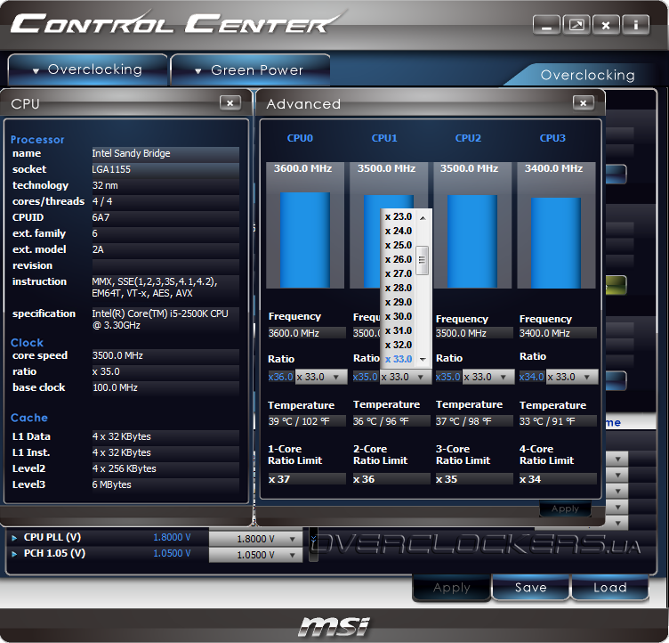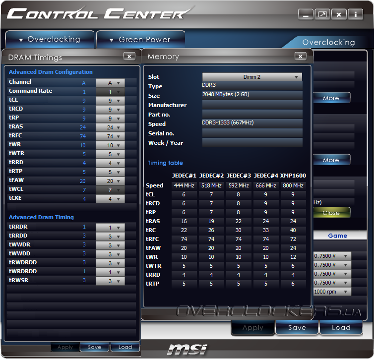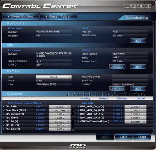 После запуска появляется окно с двумя вкладками: Overclocking и Green Power. Их содержимое и функциональность, в основном, повторяют таковые для одноименных разделов прошивки.