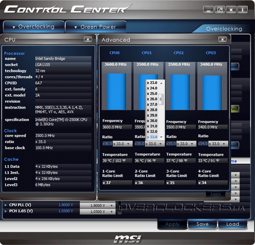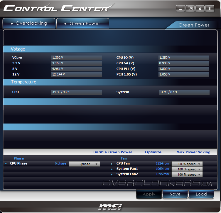 Программисты объединили информацию подраздела системного мониторинга Hardware Monitor и, собственно Green Power, сосредоточив в одном месте контроль напряжений, температур и управление скоростями вращения трех из пяти вентиляторов. Здесь же можно активировать функцию APS — Active Phase Switching. На наш взгляд, лаконичный и строгий интерфейс MSI Control Center весьма информативен и удобен в использовании. А сама программа, благодаря функциональности и отсутствию неприятных «глюков», может здорово облегчить процесс тонкой настройки системы.