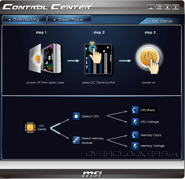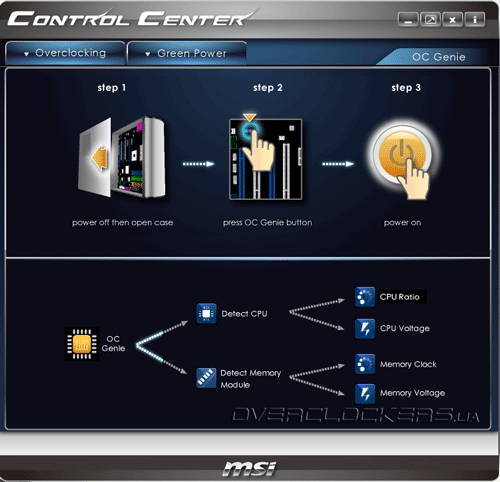 Самое приятное то, что изменение параметров «на лету» действительно работает, а не приводит к зависанию операционной системы. Пользователь может сохранять профили настроек на жестком диске, обмениваться ими с товарищами, что может быть очень удобно. Здесь же находится интерактивное руководство по автоматическому разгону OC Genie, для активации которого необходимо нажать соответствующую кнопке на РСВ и перегрузить систему.