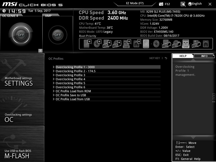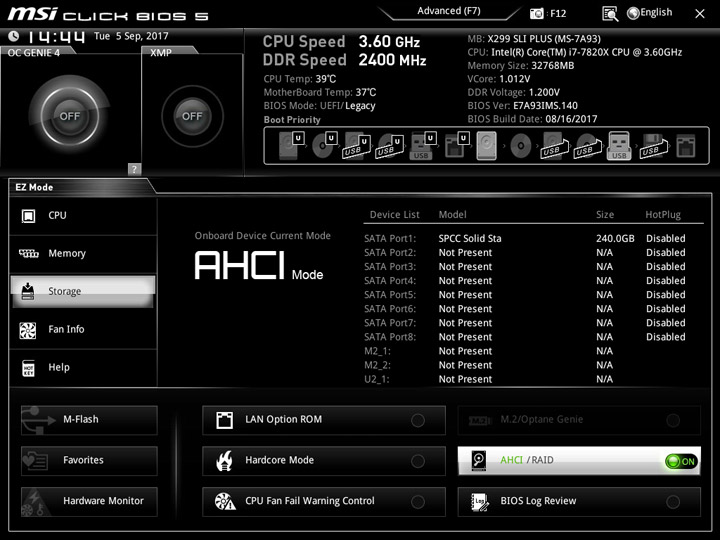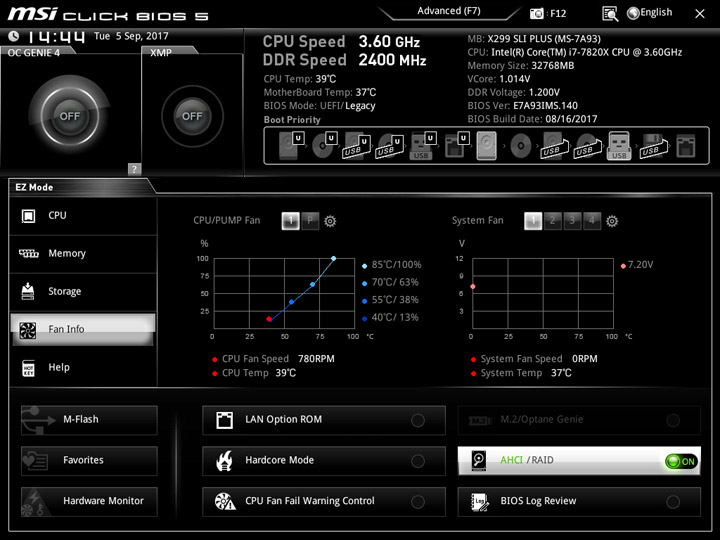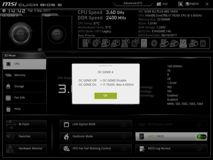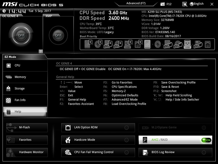 Базовый вариант отображения UEFI — Ez Mode — позволит ознакомиться с конфигурацией оборудования. Здесь можно активировать фирменный разгон для процессора и набора памяти, определиться с приоритетом среди загрузочных устройств.