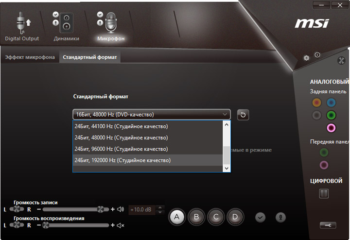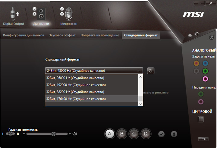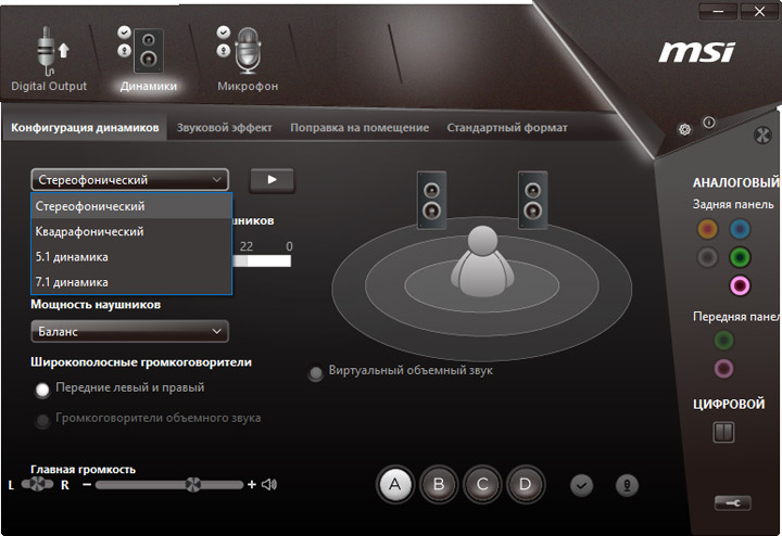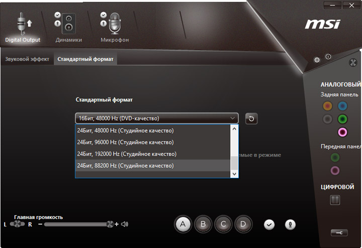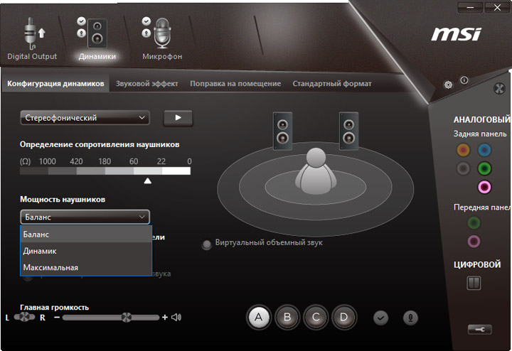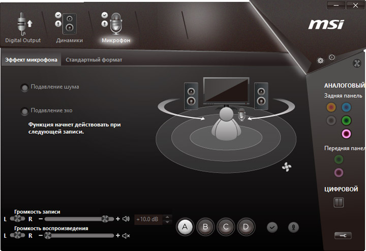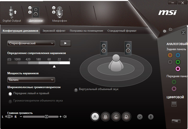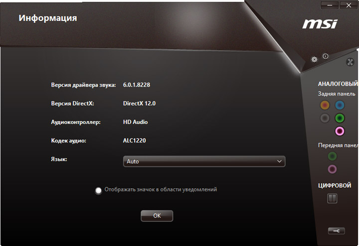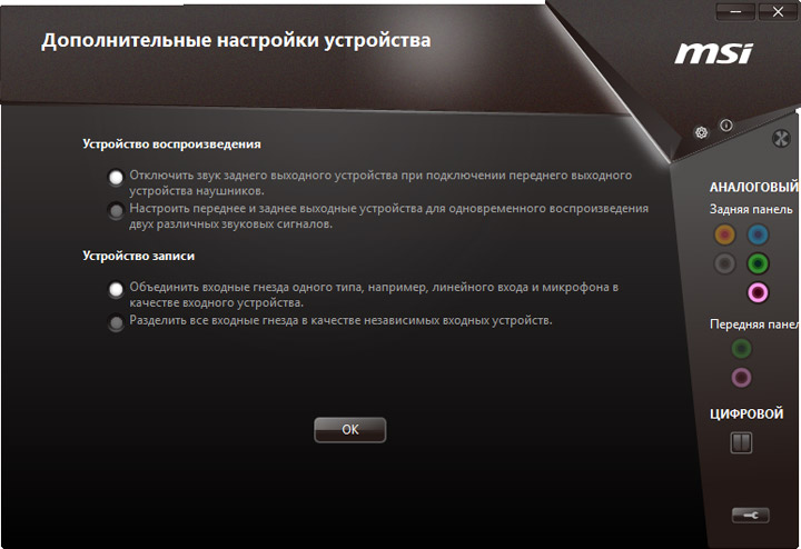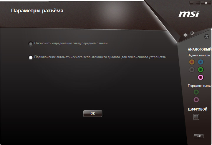 Наладка звука происходит через конфигуратор Realtek. Компания MSI решилась на обновление его внешнего вида (для своей продукции). Яркие особенности в этой модели платы отсутствуют, нет даже профилей для подключаемого основного звуковоспроизводящего устройства. Также нет бонусного ПО для изменения звучания, это участь более дорогих игровых изделий.