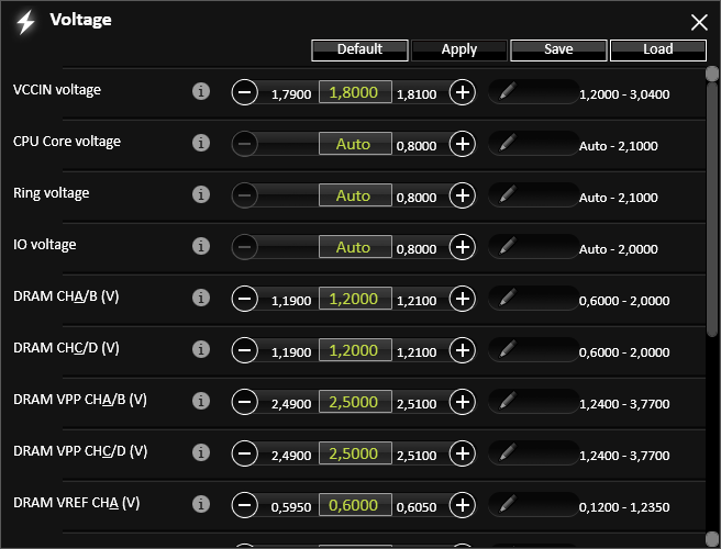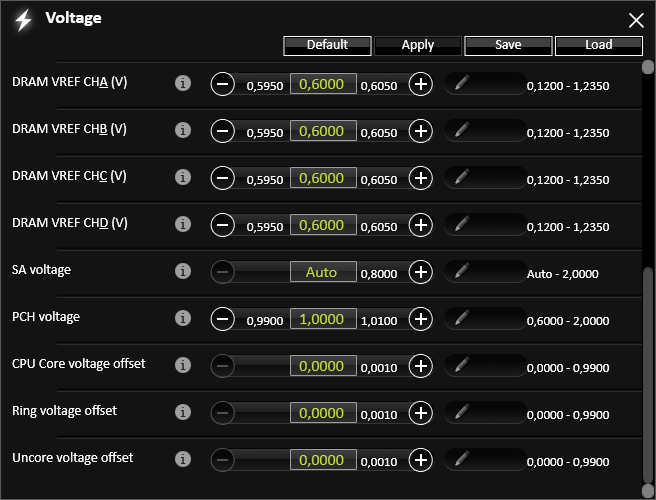| DRAM Voltage (B) | 0,6–2,2 | 0,01 |