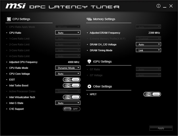 DPC Latency Tuner дополняет возможности предыдущего участника обзора ПО в сфере тонкой настройки, но всё имеющееся здесь — дубль реализованных в UEFI пунктов. Наличие в обоих случаях пунктов iGPU говорит о слабой подготовке продуктов именно для платформы LGA 2066.