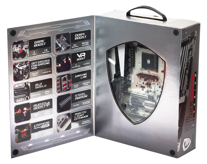 Ключевые особенности расписаны на откидной обложке, а в появившемся «окне» можно увидеть саму плату. Хочу выделить присутствие многопозиционного переключателя для проведения разгона в одно «переключение».