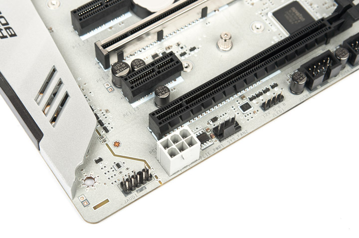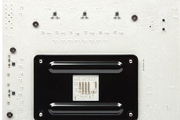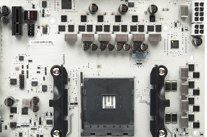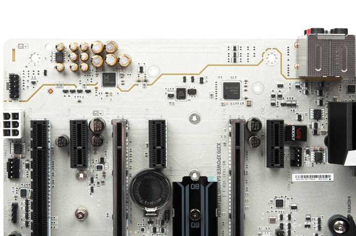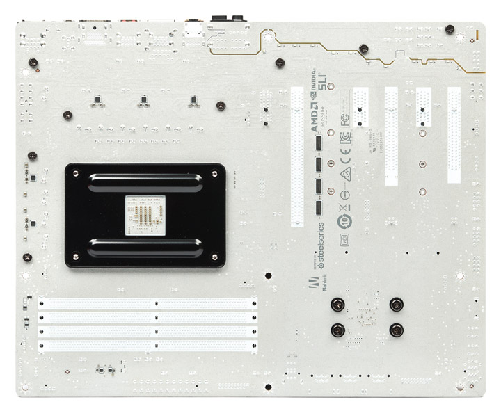На тыльной стороне электронных компонентов почти нет. Небольшая группа находится у преобразователя напряжения для ЦП, наиболее заметны тут четыре свитча, распределяющие поровну шестнадцать линий PCI-E между двумя полноформатными слотами. Имеется традиционная подсветка зоны размещения звукового кодека, организованная группой белых светодиодов и изолирующим зазором, выполняющего здесь роль световода.