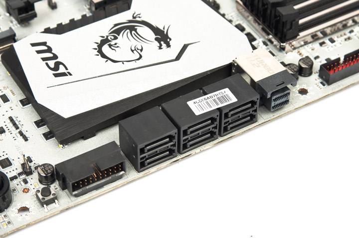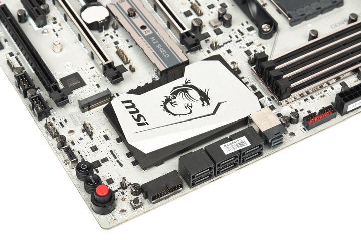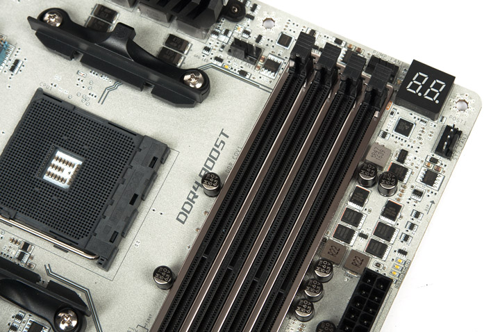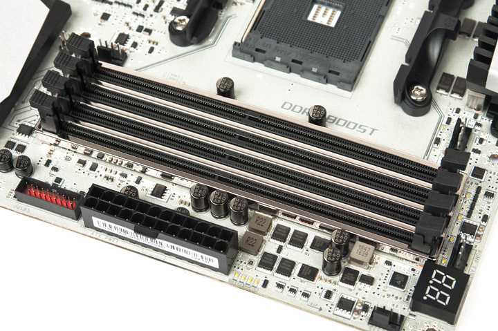 Охладитель у чипа X370 массивный. По его углам на плате есть ещё четыре белых светодиода.