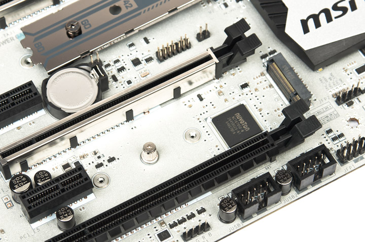 Конфигурация слотов расширения обычная, два армированных гнёзда PCI-E могут быть использованы для видеоускорителей, третье, самое нижнее, работает с хабом. Интерфейсных гнёзд PCI и COM здесь нет.