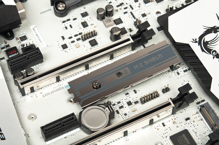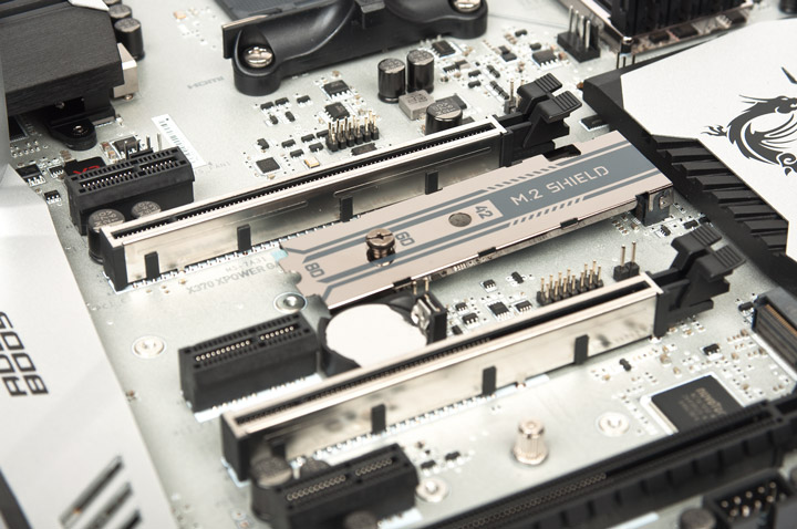 Верхнее посадочное место для устройств M.2 не будет ограничивать их размеры, хотя экранирующий щит полностью накроет только восьмисантиметровое решение. Нижнее посадочное место уже не позволит установить изделие типа 22110.