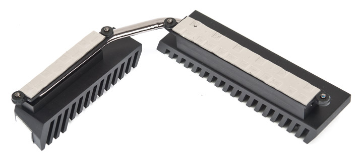 Радиаторы для обоих блоков напряжений объединены тепловой трубкой, причём она размещена действительно близко к теплосъёмнику. Контакт обеспечен парой термопрокладок средней толщины. Общий вес конструкции внушителен, есть множество рёбер, а значит, велика площадь теплорассеивания.