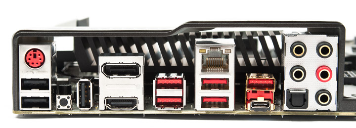 Происходит повсеместный отказ от выхода DVI, тем самым высвобождается место для других портов, что видно по задней панели платы. В частности, здесь имеется девять выходов USB — весьма приличное число. Полезным может оказаться размещение здесь же кнопки для сброса настроек.