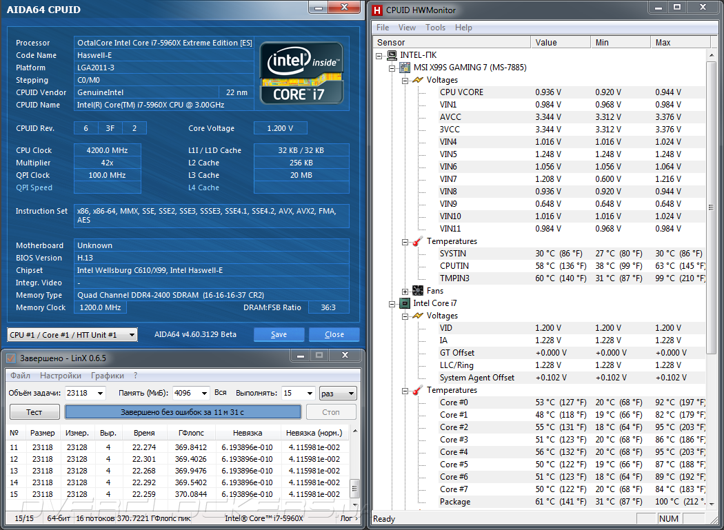 Недавнее исследование частотного потенциала процессора Intel Core i7-5960X показало, что даже несмотря на использование в качестве термоинтерфейса металлического сплава на основе индия, разгон старшего Haswell-E сопряжен с трудностями, которые связанны с огромным энергопотреблением и, как следствие, весьма высоким нагревом. В итоге, при использовании MSI X99S Gaming 7 процессор был разогнан до 4200 МГц при повышении Vcore до 1,2 В, тогда как напряжение VCCIN задавалось на уровне 1,8 В, а функция CPU Vdroop Offset Control принимала значение 87,5%. Встроенный кэш L3 функционировал на частоте 3500 МГц при увеличении соответствующего напряжения CPU Ring Voltage до 1,2 В, а модули ОЗУ работали в штатном режиме на 2133МГц с таймингами 15-15-15-36-2T. При описанных выше настройках стенд проходил длительное тестирование в программе LinX 0.6.5, использующей инструкции AVX2.0.