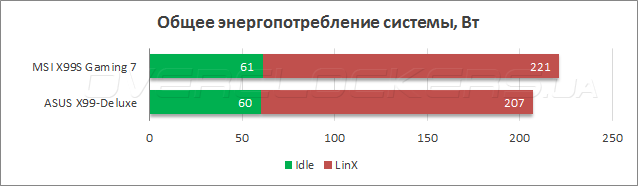 По части экономичности героиня сегодняшнего обзора оказалась не такой экономичной, как ASUS X99-Deluxe. При простое разница практически незаметна, тогда как в нагрузке энергопотребление новинки превышает аналогичные показатели конкурентки на 14 Вт. Впрочем, есть надежда, что с выходом новых версий прошивок для MSI X99S Gaming 7 ситуация изменится в лучшую сторону.