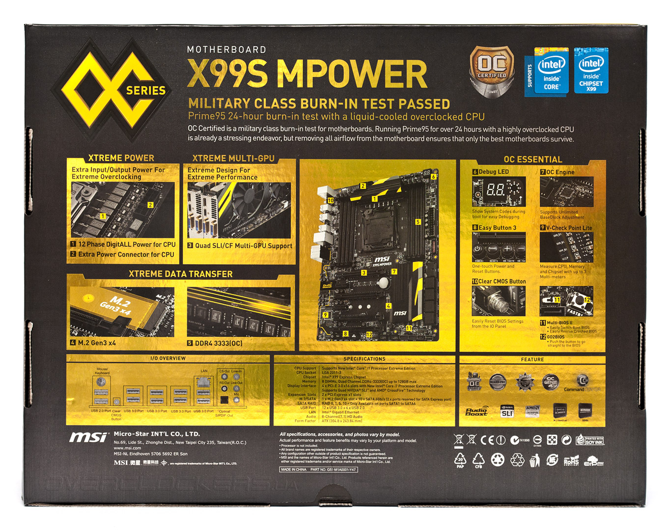 Тыловая поверхность коробки богата разнообразной информацией. Прежде всего, следует отметить логотип OC Certified, который означает, что на заводе-изготовителе системные платы MSI X99S MPOWER проходят 24-часовое испытание в режиме разгона под нагрузкой, создаваемой программой Prime95. Такая проверка позволяет выявить брак на стадии предпродажной подготовки и служит гарантией высокого качества «материнок» MSI OC Series. Также, с обратной стороны коробки указана спецификация новинки и конфигурация ее задней панели, а также приведены сведения о ключевых конструктивных особенностях продукта, с которыми мы с вами познакомимся в процессе сегодняшнего обзора.