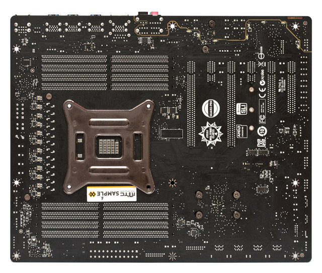 C обратной стороны печатной платы расположено некоторое количество электронных компонентов. Обращает внимание отсутствие усилительной пластины в конструкции системы охлаждения VRM, ставшей верным признаком «материнок» старшего ценового диапазона.