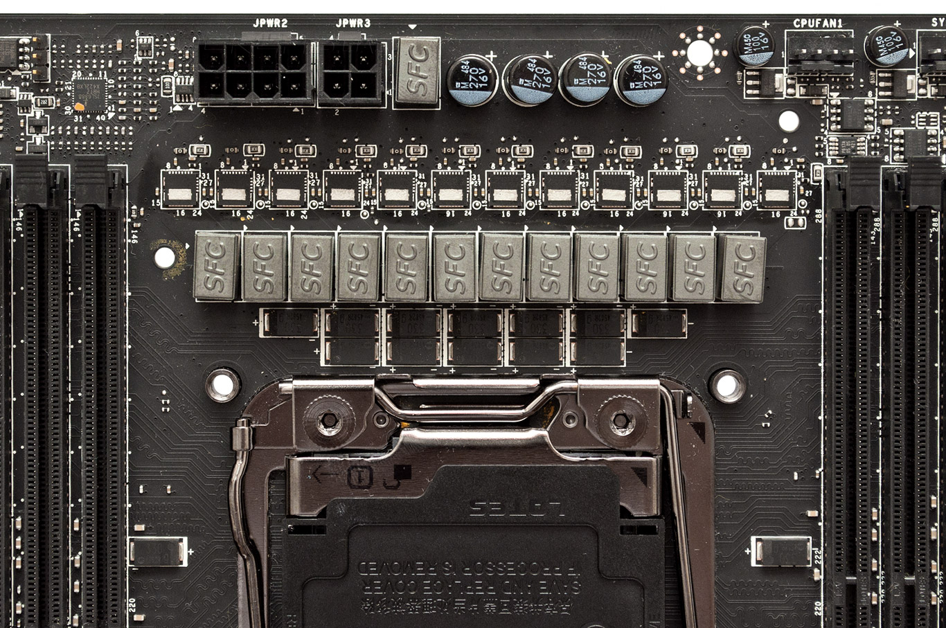 Одним из самых сильных конкурентных преимуществ MSI X99S MPOWER является ее мощная подсистема питания. Преобразователь напряжения новинки построен по 12-канальной схеме, в качестве силовых элементов применены интегральные сборки DrMOS второго поколения, а в цепях узла электропитания установлены дроссели SFC и полимерные емкости с низким тангенсом угла диэлектрических потерь. Напряжение к силовой подсистеме подводится при помощи восьмиконтакного разъема, ему помогает четырехконтактный коннектор, обеспечивающий дополнительное питание на случай экстремального разгона. За работу VRM, формирующего напряжение VCCIN, отвечает цифровой ШИМ-контроллер ISL6388, который обеспечивает управление шестью независимыми каналами, компенсацию падения напряжения при нагрузке, отключение неиспользуемых фаз в простое и многое другое.