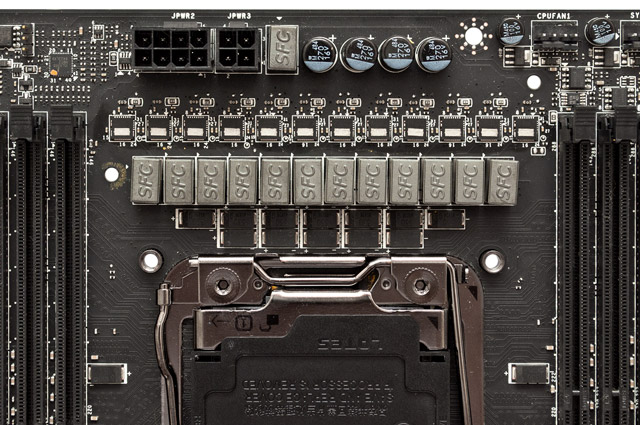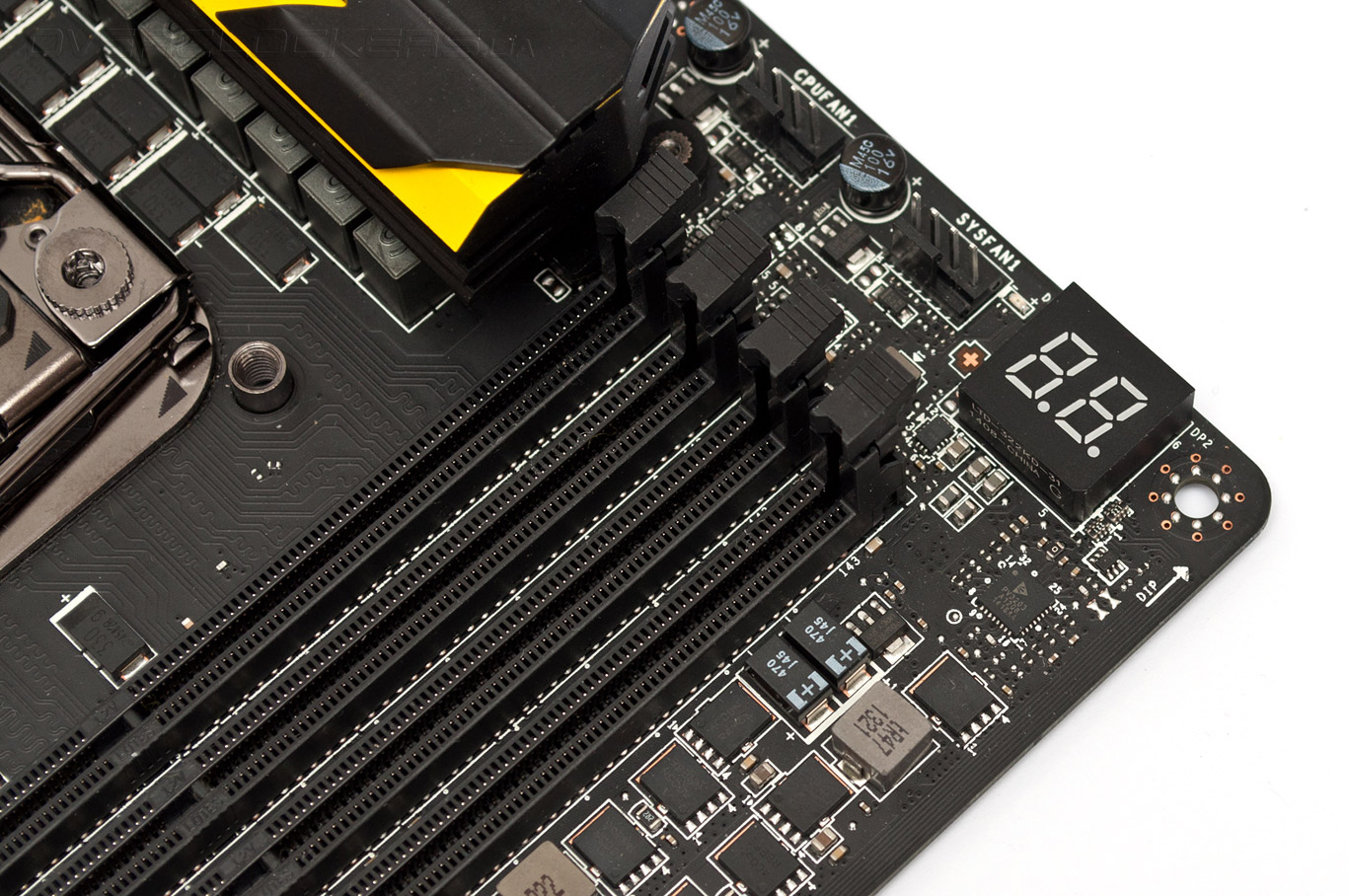 В правом верхнем углу MSI X99S MPOWER нашлось место для светодиодного индикатора кодов POST, на который после загрузки выводится текущая температура центрального процессора. Рядом с ним находится двухфазный преобразователь напряжения, управляемый ШИМ-контроллером Poweration PV3203, который отвечает за электропитание двух из четырех каналов модулей ОЗУ. Второй такой же преобразователь расположился между процессорным сокетом и первым по счету разъемом PCI Express x16.