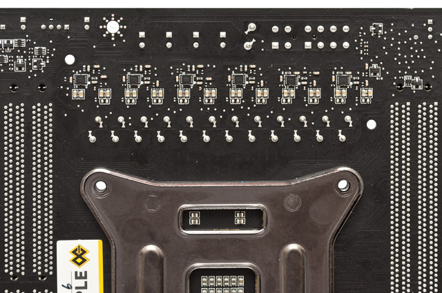 На тыльной поверхности печатной платы находятся шесть драйверов-удвоителей фаз ISL6617C, которые выделяют минимальное количество тепла, так что отсутствие для них дополнительного охлаждения не должно отразиться на стабильности при разгоне.