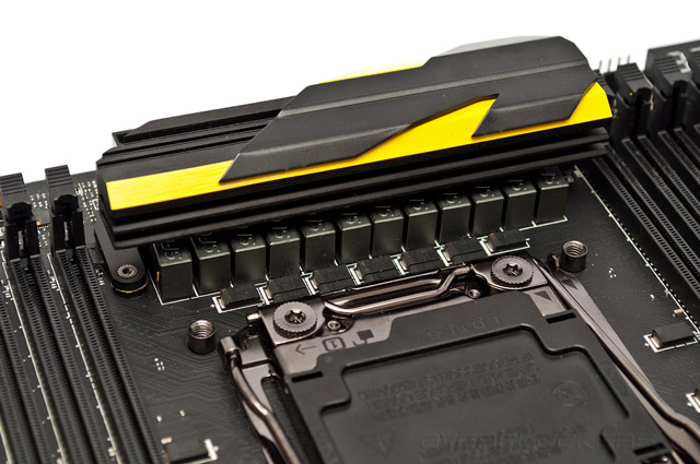 Силовые элементы охлаждаются небольшим радиатором, размеры которого выглядят более чем скромно на фоне монструозных конструкций, которыми оснащены большинство моделей конкурентов аналогичного класса. Очевидно, КПД интегральных сборок DrMOS так высок, что инженеры MSI посчитали достаточным установить охладитель столь скромных габаритов.