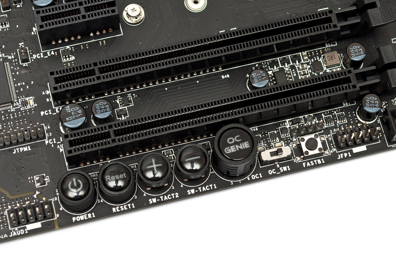 MSI X99S MPOWER оснащена целым набором инструментов для оверклокинга, объединенных под общим названием OC Essentials. На левом нижнем крае материнской платы находятся кнопки включения и перегрузки, клавиша OC Genie, включающая одноименную технологию автоматического повышения быстродействия, и переключатель OC_Switch, который позволяет выбрать один из двух встроенных профилей авторазгона. Здесь же находятся две кнопки регулировки базовой частоты, для работы которых требуется установка специальной программы Direct OC, и клавиша FASTB, запускающая функцию GO2BIOS для принудительного входа в UEFI Setup.