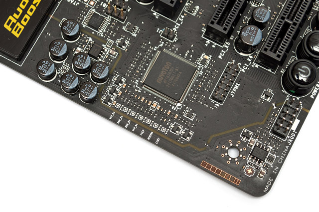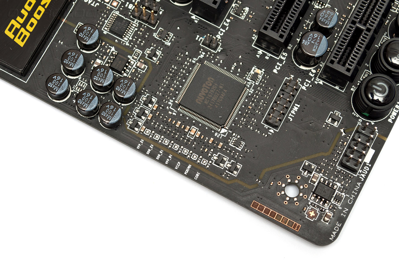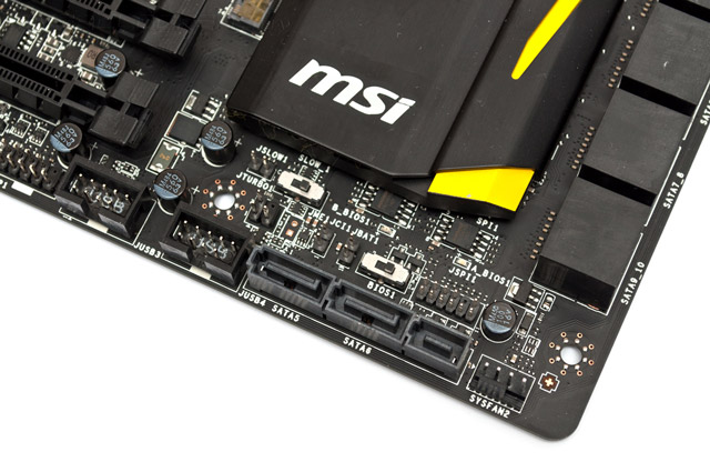Новинка оснащена парой чипов EEPROM, в которых хранятся основная и резервная копии прошивки. Микропереключатель BIOS1, установленный справа на нижнем крае РСВ, позволяет выбрать микросхему, с которой будет выполняться загрузка. Рядом с ним находится «микрик» SLOW, включение которого принудительно снижает тактовую частоту и напряжение центрального процессора, а также разъем SATA Express с пропускной способностью 10 Гбит/с, предназначенный для подключения высокоскоростных твердотельных накопителей.