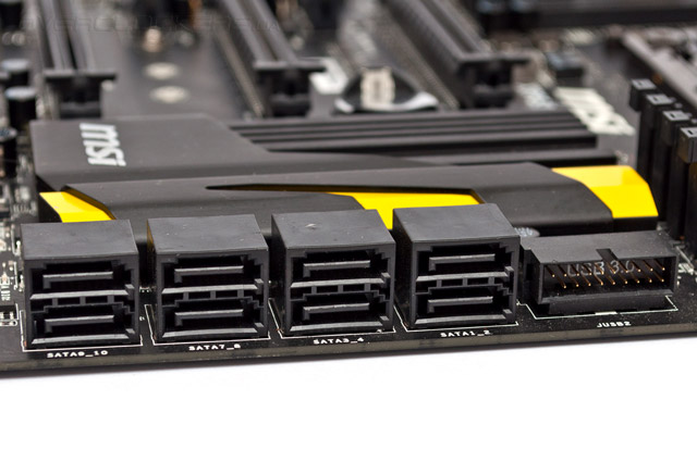 Порт SATA Express совмещен с двумя каналами SATA 6 Гбит/с, а еще восемь портов SATA 6 Гбит/с расположились по правому краю печатной платы. Все они подключены к системной логике Intel X99, но только шесть из десяти интерфейсов поддерживают создание массивов RAID и фирменную технологию кэширования Intel Smart Response.
