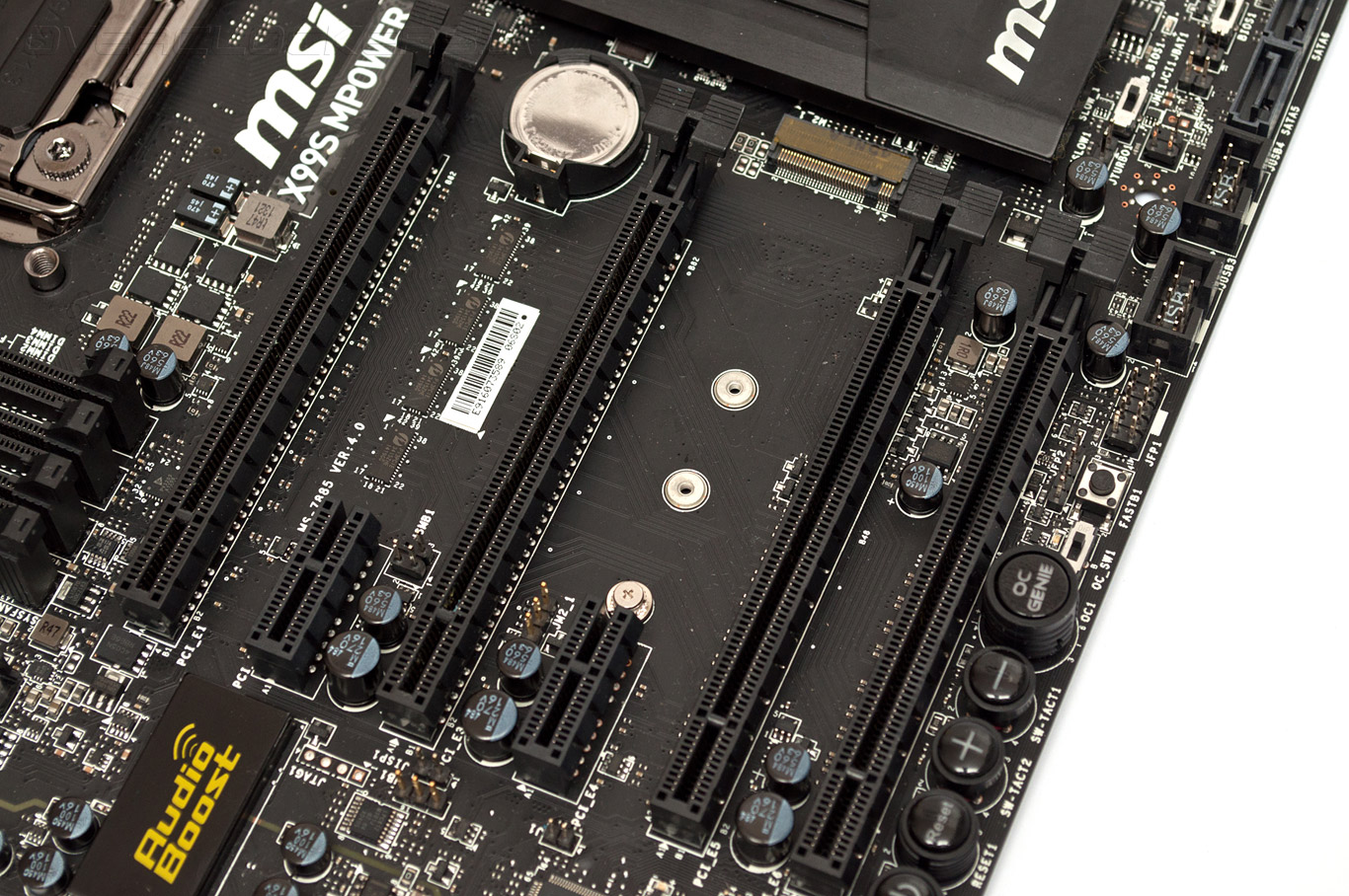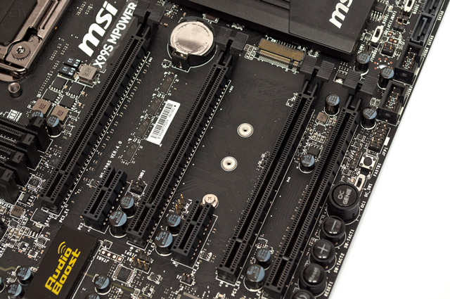 Для установки графических ускорителей новинка оснащена четырьмя портами PCI Express 3.0 x16, обеспечивающими одновременную работу трех видеокарт. В случае установки старших Haswell-E, которые поддерживают 40 линий PCI-E, слоты могут работать в режимах «x16+x0+x0+x0», «x16+x16+x0+x0» и «x16+x16+x0+x8», тогда как владельцам Core-i7 5820K будут доступны схемы «x16+x8+x0+x0» или «x8+x8+x8+x0», поскольку в процессоре количество линий PCI-E уменьшено до 28. Между вторым и третьим разъемами PCI Express 3.0 x16 находится порт М.2 для установки SSD формата NGFF, к нему подведены четыре линии PCI-E 3.0, обеспечивающие пропускную способность до 32 Гбит/с. Кроме того, материнская плата оснащена двумя слотами PCI-E 2.0 x1, предназначенными для инсталляции карт расширения.