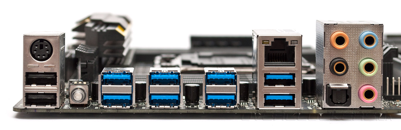 Звуковая подсистема MSI X99S MPOWER базируется на качественном 7.1 HDA-кодеке Realtek ALC1150, который для защиты от электромагнитных помех окружен защитным металлическим экраном. В звуковом тракте используются качественные полимерные конденсаторы ELNA, низкочастотные цепи отделены от остальной части печатной платы зазором в медных проводниках, а для работы с высокоомными стереонаушниками установлена пара операционных усилителей TI OP1652. За работу локальной сети Gigabit Ethernet отвечает контроллер Intel I210, а подключение разнообразной периферии обеспечивают шесть портов USB 2.0 и 12 интерфейсов USB 3.0. В итоге, на задней панели системной платы расположились: