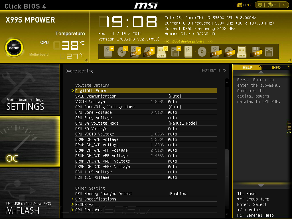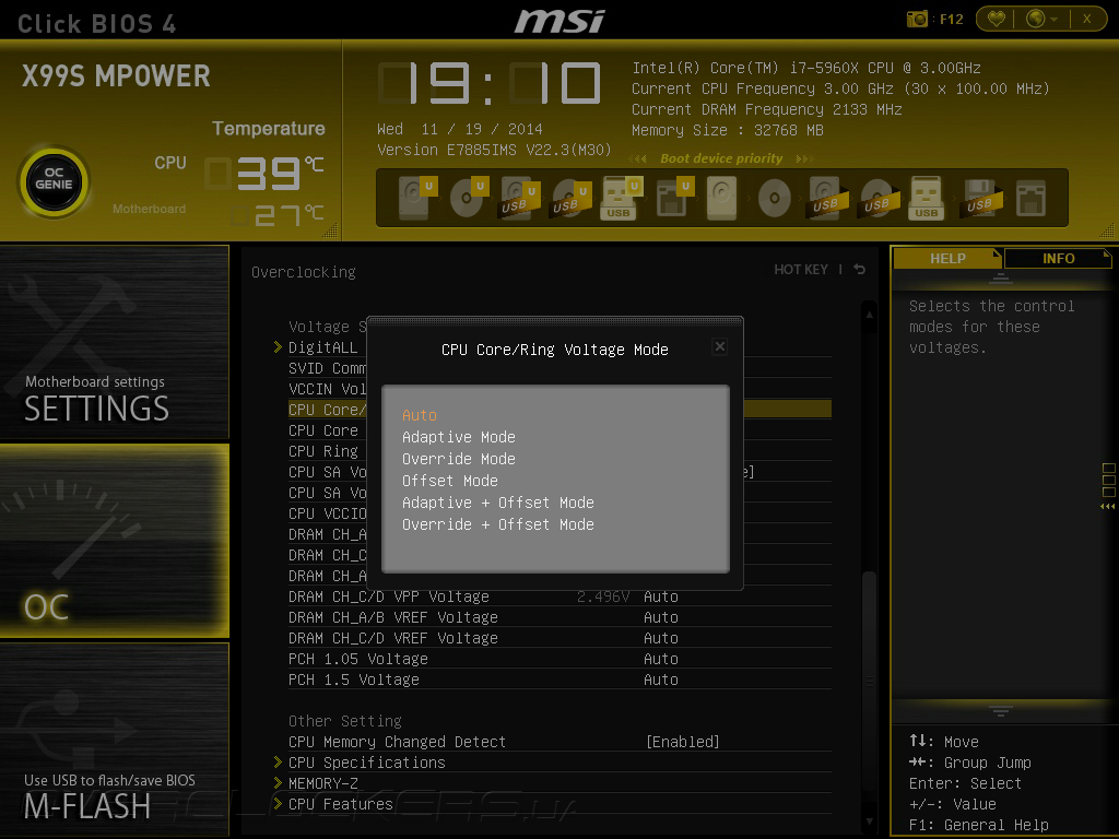 Как и подобает модели, предназначенной для работы в условиях разгона, прошивка X99S MPOWER располагает богатыми возможностями по управлению электропитанием на центральном процессоре, модулях ОЗУ и всех основных узлах материнской платы.