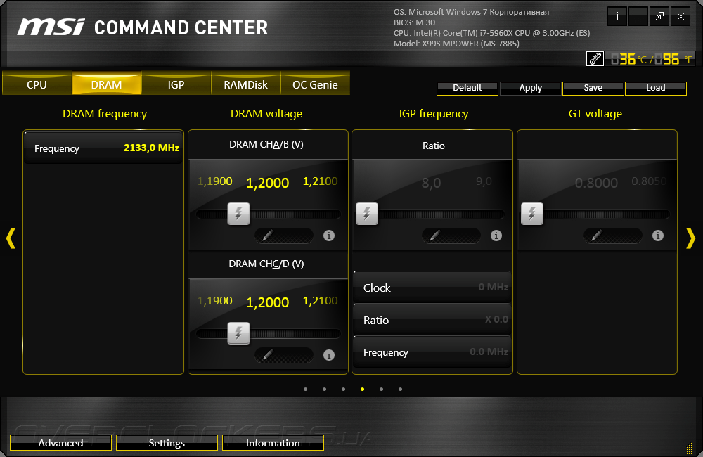 На вкладке DRAM задается напряжение для двух пар каналов ОЗУ, а вот подраздел IGP остался в программе вследствие унификации с версиями Command Center для платформы LGA1150.