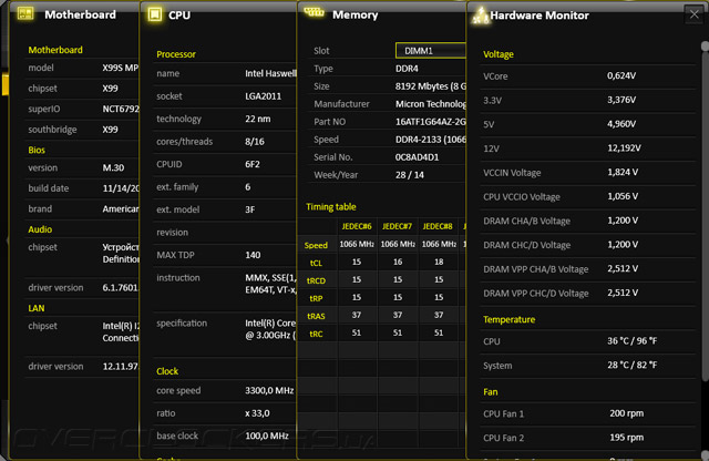 Наконец, в состав программы входят информационные модули, предназначенные для отображения подробных сведений о системной плате, процессор, модулях ОЗУ и текущих показаниях аппаратного мониторинга.