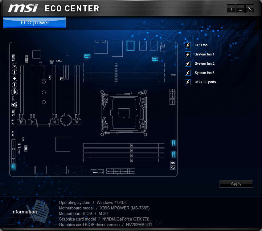 Для управления дополнительными функциями энергосбережения материнской платы служит отдельная программа ECO Center, c помощью которой можно отключить неиспользуемые порты и дополнительные контроллеры, повысив тем самым энергоэффективность системного блока.