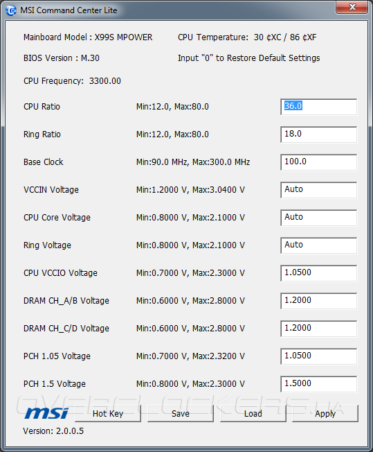 Наконец, вместе с MSI X99S MPOWER поставляется пара утилит, которые из-за своего дизайна и набора возможностей вряд ли заинтересуют рядовых пользователей, но могут быть полезными для энтузиастов разгона. Речь идет о программах Command Center Lite и Command Center Lite Memory, первая из которых предназначена для настройки базовых параметров разгона, таких как регулировка BCLK, множителя вычислительных ядер и основных напряжений, а вторая подпрограмма, как следует из названия, позволяет управлять параметрами подсистемы ОЗУ.