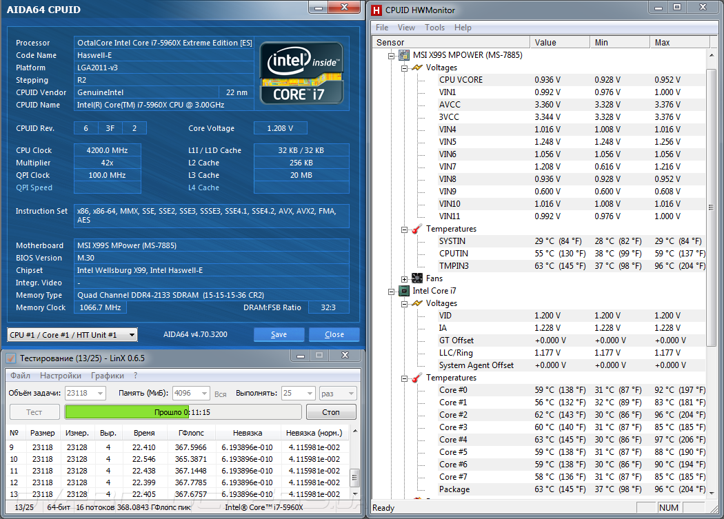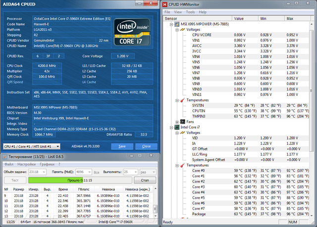 При исследовании разгонного потенциала MSI X99S MPOWER проявила себя с самой лучшей стороны. Тестовый процессор Intel Core-i7 5960X стабильно заработал на частоте 4200 МГц при повышении Vcore до 1,2 В, тогда как кольцевая шина функционировала в режиме 3500 МГц с напряжением 1,15 В. VCCIN фиксировалось на уровне 1,8 В, а функция Vdroop Offset Control принимала значение 87,5%. В таком режиме система проходила испытание в стресс-тесте LinX 0.6.5, который разогрел процессорные ядра до 97° С. По наблюдениям режим пропуска тактов для нашего Haswell-E включался по достижению 98° С, так что частотный потенциал CPU с применением воздушного охлаждения оказался полностью исчерпан. Следует отметить, что штатная система охлаждения отлично справилась с отводом тепла от силовых элементов VRM, во всяком случае, никаких признаков перегрева отмечено не было.